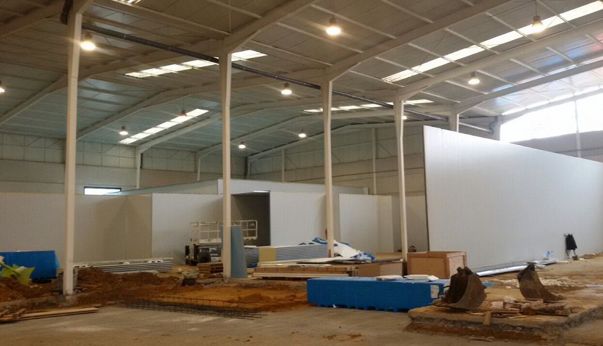 | Trabajos realizados: Instalación de panel de cubierta, panel Frigorífico, Plataformas hidráulicas de muelles, Abrigos, Puertas Seccionales, Puertas Frigoríficas, Puertas Técnicas y protecciones. | |